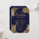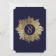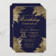 design de ouro simples, moderno e elegante com forma de folha desenhada em azul marinho, Convites de aniversário. Este design clássico e sofisticado é perfeito para o indivíduo clássico, na moda, e tradicional de aniversário. Personalize com sua própria mensagem na frente e personalize o monograma no verso. Todas as impressão de fotografias design
