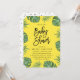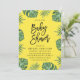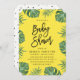 Convide convidados para um chá de fraldas de verão com convites para chás de fraldas tropicais. Os convites para o chá de fraldas moderno apresentam fundo amarelo, letra de script de pincel na moda e folhas tropicais junto ao convite.