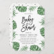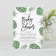 Convide convidados para um chá de fraldas de verão com convites para chás de fraldas tropicais. Os convites para o chá de fraldas moderno apresentam fundo branco, fonte de script de pincel na moda e folhas tropicais junto ao convite.