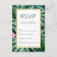 Um simples cartão de RSVP de casamento com um fundo pintado apresentando folhas tropicais pintadas em verde. Uma moldura branca sobreposta com uma borda de folha de ouro falso.