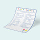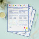Design apresenta um fundo branco para uma borda azul e texto azul. O título é exibido em cores brilhantes. As perguntas são escolhas múltiplas e relacionam-se com o desenvolvimento do Bebê. A última pergunta, porém, é personalizável e é personalizada para as Mamães-a-Ser. As letras stenciadas, "ABC", são exibidas na parte inferior, no canto direito, em cores primárias. As respostas são encontradas atrás. Também disponível em vermelho. Projetado para coordenar com a "Coleção de Chás de fraldas ABC".