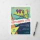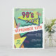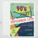 Folheto temático do Partido 90, com tipografia divertida do "Partido dos 90''. O design inclui elementos de blues, laranjas e pinks, bordas amarelas, cortadas, padrões geométricos e formas inspiradas na década de 90. Inclui um modelo para personalização pessoal.