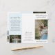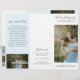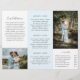 Folheto de fotos modernas triplicando com uma foto na frente com seu nome comercial acima e o título do folheto abaixo, sobre um fundo branco. O painel traseiro externo tem suas informações de contato com o cabeçalho em uma fonte elegante escrita à mão. O painel dentro tem um modelo para informações junto com uma foto na parte inferior sobre um fundo azul pastel. O dentro tem uma imagem nos painéis esquerdo e direito, juntamente com um modelo para informações à esquerda, seus pacotes no meio e uma lista de preços A la carte no painel direito. Este folheto profissional é perfeito para um fotógrafo de casamento.