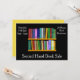 Um cartão de convite adequado para uma venda em segunda mão de livros, contendo livros bonitos e coloridos, numa prateleira de livros e texto personalizável.