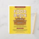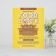 O folheto de arrecadação de fundos da unidade de comida apresenta caixas de papelão carregadas com comidas enlatadas e um plano de fundo amarelo. O objetivo do Flyer é promover doações de comida para alimentar os famintos.