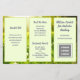 Folheto do folheto de orçamento para pequenas empresas para personalizar de ambos os lados e dobrar em três. A natureza tematizada de fundo é a grama verde com flores e sol. Todo texto é púrpura escura. Cada lado deste papel de tamanho 5x8 tem três seções com modelos de texto. Adiciona também um logotipo, código QR e / ou foto nos espaços fornecidos. Se você não quiser usar um ou mais detentores de imagem, remova-a indo para a "ferramenta editar no design" que pode ser encontrada rolando até a parte inferior da área de personalização. Na área de design, escolha a imagem clicando nela e pressione o símbolo "lixeira" da imagem. Alterar o tamanho do papel pode alterar o design para não ajustado corretamente. Entre em contato comigo se quiser ajuda.
