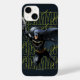 Veja esta ilustração de Batman balançando de seu gancho batendo, com seu nome na fonte elétrica atrás dele.