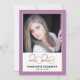 Este convite de festa de formatura moderno apresenta uma foto quadrada na frente e uma foto vertical de cheio no verso. O tema da cor é roxo e ouro, com o ano de graduação de 2020 aparecendo em um roteiro elegante.