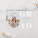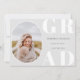 Fotograma frontal arredondada, anúncio/convite de graduação em classe de mais velho. Fundo de cor da cinza prateada clara, tipo branco e negrito "FORMANDO" e linhas modelo de texto da cinza para o nome do formando, classe do ano e escola. A parte traseira da placa apresenta dois espaços de fotos e linhas de texto adicionais para informações sobre a parte ou outras informações sobre o formando.
