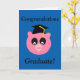 Placa de Formando de parabéns. O dentro diz "Ham-no por um trabalho bem feito", um porco rosa engraçado vestindo boné de formatura.