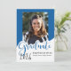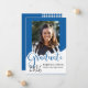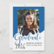 Este anúncio de graduação de fotos reluzente apresenta a palavra "formando" em letras grandes e azuis com um lugar para sua foto favorita. A parte de trás é uma design azul e branca com um boné de formatura.
