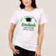 Estas modernas t-shirts de formando mais velho, personalizadas, com script verde, apresentam o seu nome de segundo grau ou de universidade para a classe de 2025. Personalize com o seu ano de graduação com o script manuscrito chic e o boné formando preto para um excelente personalizado de festa de formatura para mais velho.