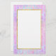 Papel de papelaria com um padrão de fundo abstrato. As aquarelas roxas e azuis cor-de-rosa formam este design artístico que apresenta formas retangulares verticais sobre um fundo malhado. Um retângulo colocado sobre cima com uma borda falsa de folha de ouro, para você escrever dentro.