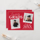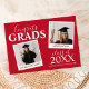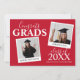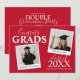 Convite moderno de festa de formatura dupla, que apresenta 2 fotos dos formandos. O cartão tem texto modelo que diz 'PARABÉNS FORMANDOS, SEUS NOMES, ANO DE FORMATURA e NOME DA ESCOLA OU FACULDADE'. Com um modelo de convite elegante no verso.