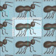 O tecido apresenta linhas de formigas de desenho animado, marchando ao longo de um fundo azul. Criado de uma ilustração do marcador original.