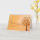 Árvore com folhas vermelhas, laranja e castanhas no outono caindo sobre um fundo cor de laranja abóbora. O texto na frente do cartão diz, "Dê Obrigados". Personalize a mensagem sazonal de Ação de Graças dentro no cartão com seu próprio texto.