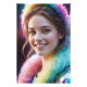 テクノロジーとファンタジーが交差する、鮮やかなデジタルポートレートです。輝くような笑顔を浮かべる女性が、虹色の柔らかな雲のようなフリースと、繊細で未来的なメタリックのアクセントに包まれています。
