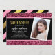 O Convite de aniversário de Fotografia Rosa-Glitter apresenta as palavras "Doce Dezesseis" em uma fonte sans serif divertida em uma folha de ouro falso, com brilho rosa superior e inferior e um fundo central preto na frente. O convite tem um padrão de listras de folha de ouro rosa, pretas e sujas. Personalize-o substituindo o texto do marcador de posição e substitua a foto do marcador de amostra/marcador de posição por sua própria foto. Para obter mais opções, como alterar a fonte e seu tamanho/cor ou o espaçamento entre letras, clique no botão "Personalizar". *Observe que a Marca d'água do Zazzle que aparece na visualização de zoom NÃO aparecerá no produto impresso final. Espaço reservado Fotografia © Storytree Studios, Stanford, CA Invitation © Rosewood and Citrus