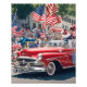 Imagem de design com um desfile de 4 de julho, inspirado na vintage, com carros clássicos, bandas marchantes e espectadores em trajes retrorreflectores.