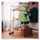 Jaqueta pendurada num carrinho rolante perto de uma mala colocada no chão.