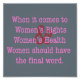 No texto cor-de-rosa lê-se: "No que se refere aos Direitos da Mulher e à Saúde da Mulher, as Mulheres devem ter a palavra final." O sinal "e" é vermelho, é colocado em segundo plano no texto cor-de-rosa e é alargado ao cobrir tanto dos "direitos" como da "saúde" do texto cor-de-rosa.
