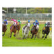 Um campo de cheio de nove cavalos voltando para casa no topo do trecho no turfe de Parx e casino. O maior momento da corrida quando os pedestres se transformam no trecho para a direção final da linha de chegada. Liderando o caminho, a cinza branca "Rápido e Exato" lidera a carga com Jockey Ortiz jr nos ferros. Erva verde, céu azul e seios brancos na histórica Parx para a corrida das estacas de Alphabet Soup. Fleetphotoname