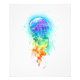 Água-viva grande, iridescente, desenhada artisticamente, brilhante, com longos tentáculos em branco, pintada sobre fundo de aquarela multicolorido. Água-viva arco-íris.