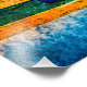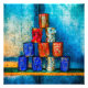 Pirâmide de dez latas vazias de sopa de cores brancas, azuis e vermelhas contra a parede de metal verde. Algumas latas são passadas. Fotografia estilizada e texturizada.