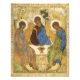 pintura cristã medieval de andre rublev sobre sua interpretação da trindade com três anjos com asas ouros, halo, verde, vermelho e manchas de ouro, sentados ao redor de uma mesa. arte ilustrativa fina em dourados e verdes, em uma delicada e refinada pintura religiosa.