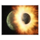 Essa ilustração astronômica é um conceito de artista de como ela pode parecer se um corpo celeste do tamanho da lua colide com um planeta do tamanho do Mercúrio. Tal colisão emitiria um grande flash de luz brilhante, e matéria rochosa ejetada no espaço. Essa imagem da arte espacial é da missão do Telescópio Espacial Spitzer, e os astrônomos sugerem que a lua terrestre se formou dessa forma. Crédito da Imagem: NASA/JPL-Caltech Há mais produtos com esta ilustração espacial na Loja de Compro de Ofertas Astronômicas.
