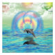 2 golfinhos nadando no oceano perto de uma bela ascensão de cores e água com 2 planetas, uma lua e um sol colorido. Cor rosa, azul, aqua, amarela e verde na água e no céu.