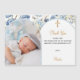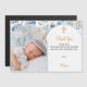 Um Cartões de agradecimentos magnético. Adicionar uma foto de tamanho vertical. Um pequeno arco azul colorido em forma de fotograma. Uma cor de fundo branca, decorada com forais azuis, flores. Personalize e adicione um nome e detalhes.