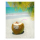 Bebida tropical de coco com palha numa praia arenosa branca com oceano Caribe no fundo e folhas de palma acima