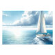 A serene coastal watercolor portraying a solitary sailboat gliding across calm blue waters beneath expansive, cloud-filled skies. Soft gradients of aqua, cerulean, and sunlit white create a tranquil rhythm, while gentle reflections ripple across the sea, evoking quiet movement and open possibility. The composition feels airy and contemplative, balancing vast sky and water with a sense of peaceful journey and timeless escape. This artwork captures a soothing coastal mood rooted in calm, freedom, and light, perfect for those drawn to breezy horizons and reflective moments by the sea. AI generated artwork.