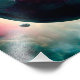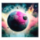 Uma bola de futebol realista como um planeta no espaço com fumaça rosa e explosões, com três luas ao fundo, arte digital.