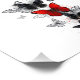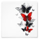 Bando de borboletas voadoras, realistas, vermelhas e pretas em fundo branco com gotas de tinta.