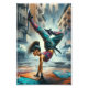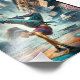 A design mostra uma cena animada em que uma dançarina de break toca em cheio balançando na rua. O personagem principal, o dançarino de pausa, está no meio de um poderoso suporte de mão.