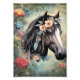 A horse's head with a lush mane. A beautiful brown horse among flowers.