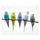 Row of budgie birds on a tree branch