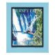 Uma pintura digital de uma cascata encontrada na Califórnia, Burney Falls. Uma borboleta marrom e branca está em um galho que se estende através da vista cênica. Imagem Copyright ©2023 Kimberly J Tilley.