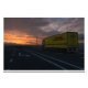A imagem mostra um caminhão dirigindo em uma autoestrada no pôr do sol, capturando um céu bonito e dramático com tons ricos de laranja, amarelo e roxo. O caminhão, com marca nítida amarela e vermelha, se destaca contra a paisagem serena e expansiva. A estrada é larga, com faixas claramente marcadas, indo até à distância, sugerindo uma viagem ou longo curso. Linhas de energia e uma torre de transmissão podem ser vistas silenciadas contra o céu, acrescentando profundidade e sentido de escala à cena. Essa imagem exude temas de transporte, aventura e a estrada aberta, fazer ideal para um poster de compro na web focado em temas de logística, viagem ou jornada.