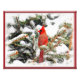 Cardeal masculino emperrado em um cheio de pinheiro de neve