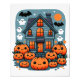 Estampa Divertida de Halloween com uma ilustração encantadora de Halloween mostrando uma casa assombrada caprichosa brilhando com janelas laranja, cercada por abóboras sorridentes. Fantasmas amigáveis flutuam no céu noturno enquanto morcegos adicionam um toque de diversão assustadora. A mistura lúdica de assustador e adorável captura a alegria da temporada de doces ou travessuras. Um design festivo para aqueles que amam a magia leve do Halloween.