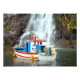 Um barco de pesca fotografado contra o pano de fundo de uma cascata; Fjord Quintupeu, Patagônia Norte, Chile - um belo canto da América do Sul onde os Andes mergulham no Oceano Pacífico. [Nossa fotografia e designs de viagem estão disponíveis como presentes para a casa, cartas, quebra-cabeça de serra, arte de parede e muito mais]