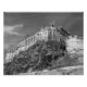 Foto em preto-e-branco do Castelo de Edimburgo, sentado no topo do Castelo Rock, tirada da área de Grassmarket de Edimburgo. O castelo esteve envolvido em muitos conflitos históricos, incluindo as guerras da Independência Escocesa no século 14 e a Ascensão Jacobita em 1745. O castelo afirma ser o edifício mais sitiado da Grã-Bretanha Excelente e um dos locais mais atacados do mundo.