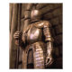 Uma foto de um Cavaleiro de terno dos tempos medievais. Ele está guarda em frente a uma velha porta do castelo.