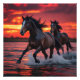 Uma exibição surpreendente de potência bruta e elegância — dois garanhões poderosos carregam através da água, seus casacos escuros brilhando contra um pôr do sol feroz. O céu queima com paixão, a água dança em seu acordar, e o espírito da natureza é liberado neste momento eletrizante. Isto é mais do que uma fotografia; é um vislumbre no coração da natureza.
