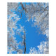 Uma cena de inverno nevado olhando para cima através das árvores que estão cobertas de neve contra um céu azul brilhante.