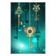 Chaves Douradas e antigas com engrenagens e marcadores penduram em correntes douradas sobre fundo verde luminoso.
