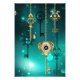 Chaves Douradas e antigas com engrenagens e marcadores penduram em correntes douradas sobre fundo verde luminoso.